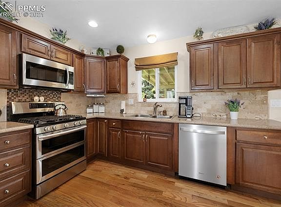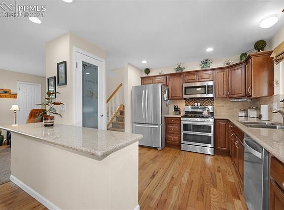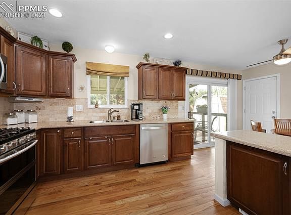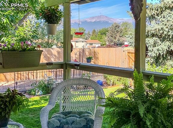 Absolutely adorable home ready to enjoy! Located on a quiet tree lined street with a Pikes Peak view!* This beautiful home offers a new furnace* new humidifier* new air conditioning* fabulous covered deck (like an outside living room!) with a Pikes Peak view, soft solar lighting, and a misting system for the warm summer days* Granite counters* Stainless appliances* Glowing wood floors in the kitchen and dining room* gas fireplace in the family room* Large storage shed* Tall mature trees* RV parking and double gate in the back for entry*Fenced rear yard* Covered walk out to lower level* Landscaped* The mulch front and back is rubber mulch (like playgrounds) that does not break down and is soft for walking and playing on* Backs to a church grassy area and large parking creating privacy in back* Must see and take delight in this great home!