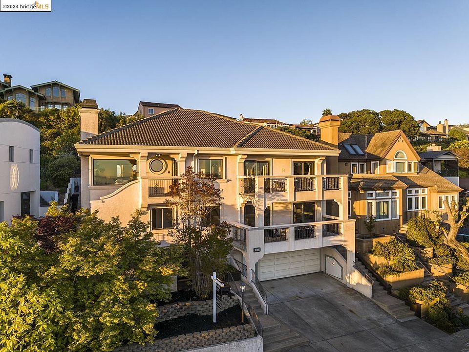 This light filled Upper Rockridge Mediterranean offers an inviting blend of comfort and style. With 3+ bedrooms and 2.5 baths, it boasts panoramic vistas of San Francisco, the Bay, and the iconic Golden Gate Bridge. Enter the front door to welcoming, open spaces. An alluring backdrop of the city skyline enhances the living room with fireplace and the adjacent formal dining room. Designed for effortless entertaining, the open kitchen with breakfast nook seamlessly transitions to a spacious view deck, while the family room, complete with its own fireplace and wet-bar, extends to the expansive backyard—a lush retreat for relaxation, gardening, and outdoor fun. Retreat to the serene primary suite on the same level, offering sliding doors to the rear yard, a spacious bathroom, and a walk-in closet. Downstairs, two additional bedrooms with access to a shared deck, a full bath, and a convenient laundry room. With the potential to convert bonus spaces into a fourth bedroom, there's ample opportunity to tailor the home to your needs. Elevator access to all floors enhances convenience and accessibility. Experience the lifestyle of Upper Rockridge in this captivating home - a sanctuary where panoramic views and stylish comfort in a friendly neighborhood converge seamlessly.