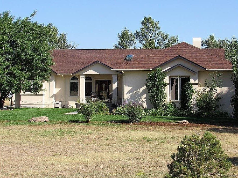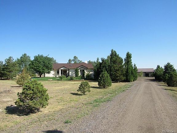 This Large Ranch Home is Professionally Landscaped with Mature Tree's, a Front & Backyard, Garden Beds & a Beautiful Pond with Waterfalls! A Circle Drive Allows for Easy Access to the 50X60 Airplane Hangar/Outbuilding with a 13.5' Bi-Fold Door and 12' Lean-To Off the Back with Garage Access. You Can Fly Your Personal Aircraft from the 1/2 Mile Runway on the 37+ Acres. The Open Floor Plan Offers 3 Bedrooms + an Office Upstairs, Sunken Living Room & Dining Room, Vaulted Ceilings & Crown Molding. The Living Room, Master Bedroom & Main Bathroom all have Access to the Redwood Deck that Spans the Back of the Home. Wood Casement Windows & Trim, Canned Lighting, Granite Counter-tops, Marble & Granite Flooring & Stainless Steel Appliances. Downstairs has a Bar Area for Entertaining, 1 Bedroom, 1 Bathroom & 2 Large Open Living Areas. Right Off Highway 79 w/ a Short Commute to DIA & Denver. Call Listing Agent for More Details!