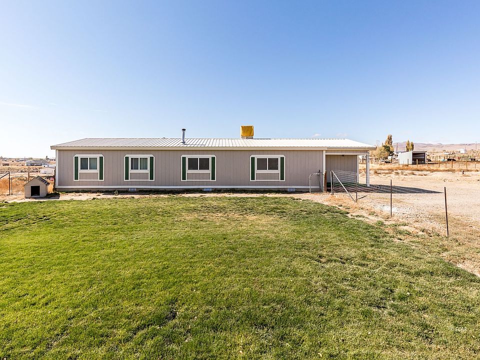 This well cared for home has all new paint on the exterior and interior and a metal roof. The property is fenced with additional fenced off area on the front lawn for small pets etc. Gravel driveway. You enter into the main living area with a sitting, dining, and fireplace sitting room. All open from the kitchen. On one side the master sits with a large closet and bathroom with a separate tub/shower. The kitchen has newer stainless appliances including a Samsung 5 ring gas cooktop and convection oven. The laundry area provides access to the backyard. Rear door has automatic dog door and collars which operate that will be left for buyer. On the other side of the home are 3 bedrooms and another full bathroom, recently remodeled also. There is RV hookup on the back side of the home.