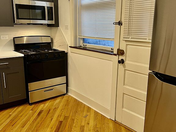 Fully Updated 2 bed/ 1 bath on quiet dead end street in Albany Park. Corner unit with walls of windows throughout. Enjoy a new dine-in kitchen featuring 42" cabinets, brushed metal hardware, quartz countertops with matching quartz backsplash, and stainless steel appliances, including a dishwashe and microwave. The spacious living room is filled with natural light. The renovated bathroom has a new tub, marble-inspired tile, a stylish vanity, and modern fixtures. Both extra-large bedrooms easily fit king-size beds and include walk-in closets.