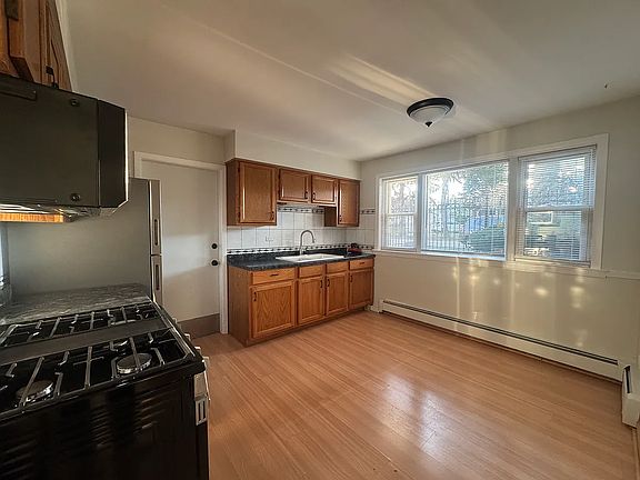 Beautiful unit has large living room, eat in kitchen includes New appliances: Stove, Refrigerator, & over the stove microwave, 2 Bedrooms with closets, 1 Full Bathroom, Lament flooring, Coin washer/ Dryer- in building, common yard, street parking no permit. Must see