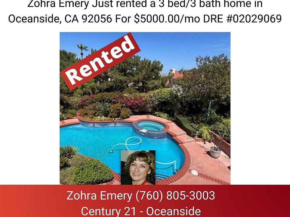 Executive Home For Lease in the hills of Oceanside, 3 bedroom, 2.5 Baths, 1915 sq.ft, Pool/Jacuzzi in the gated community of Ocean Terrace. Proximity to the 78 & 5 Freeways. Greenbelts, Palm trees and an exquisite neighborhood with beautiful landscapes, gorgeous view points. 2 level home with 2 car garage. A formal living room and a family room, Vaulted ceilings, 2 fireplaces, pillars, designer front door, upgraded granite kitchen counters, accent paint walls, Laminate and Travertine flooring. A gorgeous private fully landscaped backyard with a pool, jacuzzi, barbecue, fire pit, fruit trees of fig, apricot. pomegranate and tangerines. Electrical vehicle Plug source installed, washer/dryer and more. Landlord pays HOA, Pool maintenance, & Gardner. Call Zohra Emery Century 21 Mission Realtor DRE 02029069. for more details or a showing. Owner pays HOA fee, Gardner and Pool Maintenance. Tenants pays their utilities. No Smoking inside the property. Pet deposit required. 2 Car garage with electrical vehicle charger installed. 2 car additional parking in the driveway.