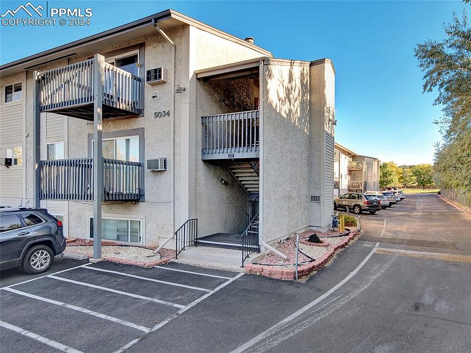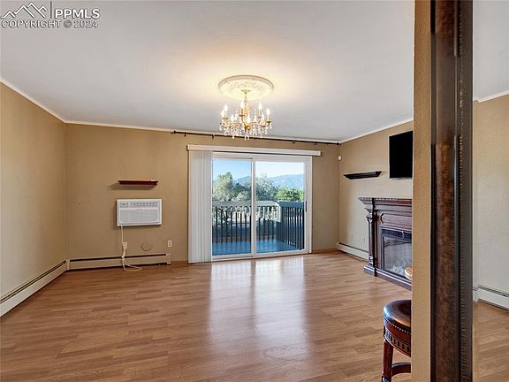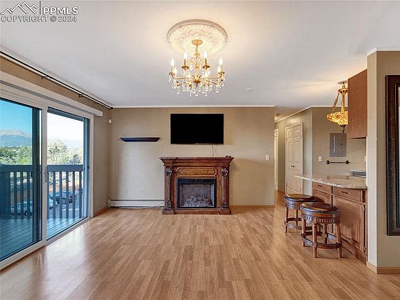 This top-floor condominium offers spectacular, unobstructed views of Pikes Peak, making it one of the rare gems in the building. With 2 bedrooms and 1 full bathroom, this home is perfect for those seeking both comfort and convenience. The open deck provides a serene outdoor space where you can enjoy stunning mountain views year-round. Inside, the updated kitchen features sleek granite countertops, stainless steel appliances, and rich cherrywood cabinetry. A breakfast bar adds functionality and style, making it the perfect spot for casual dining. The living area boasts an electric fireplace and durable vinyl flooring, creating a cozy and low-maintenance living space. Additional features include a wall-mounted air conditioning unit and an upgraded electrical panel, ensuring comfort and modern efficiency. Storage is no issue here, with both an internal and external storage closet providing ample room for your belongings. The property comes with an assigned parking spot, and you'll have access to a variety of community amenities, including a pool, a green space, and a clubhouse. Plus, with all utilities (except stormwater) included in the HOA fee, you'll enjoy worry-free living in this well-maintained community. Don’t miss your chance to own this exceptional affordable condo with breathtaking views and modern updates!