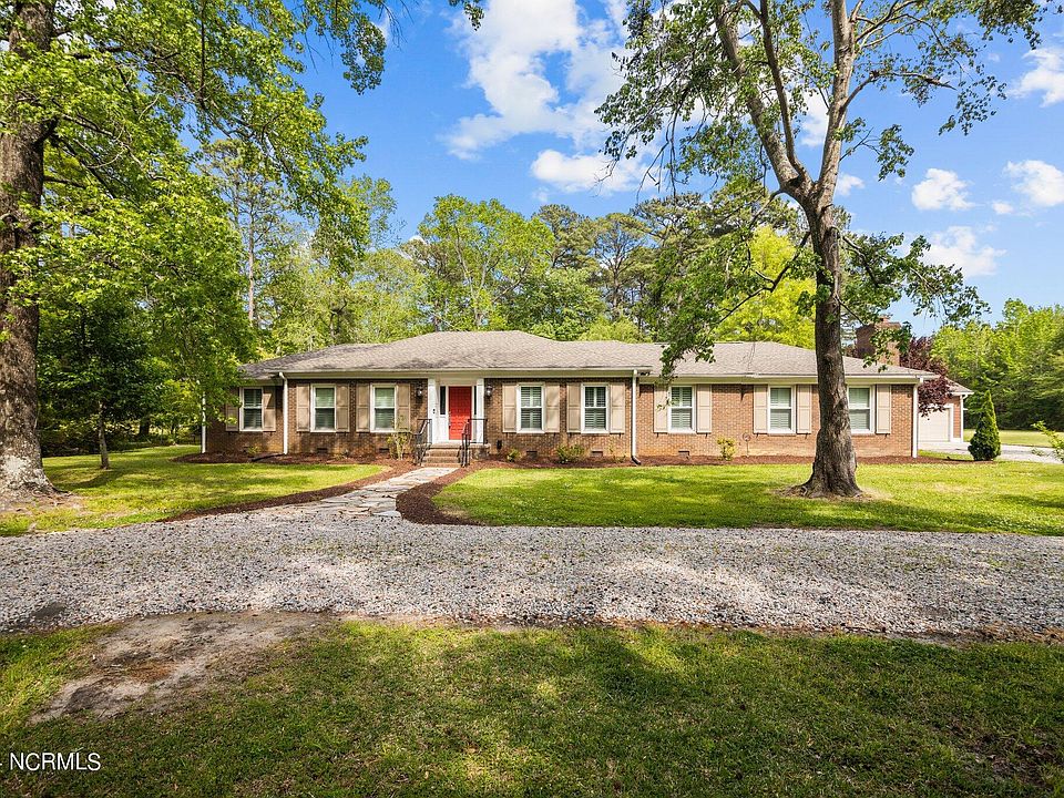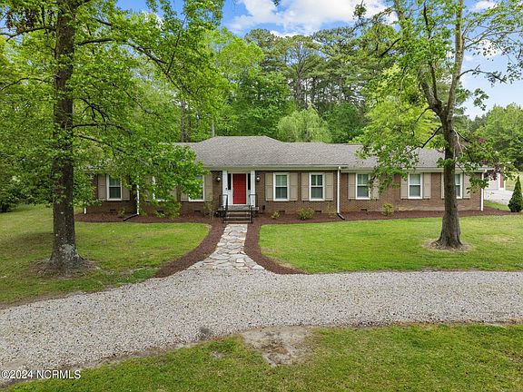 Just outside of Washington, NC you will find a spacious brick ranch on almost 4 acres. This home has character, spacious rooms, custom cabinetry, interior and exterior shutters, gas logs and a large wood burning fireplace. First, the gourmet kitchen and huge island with open gathering space, gas cooktop, double oven, dishwasher with drawers, granite countertops, travertine tile floors, lots of natural light and a spectacular view of the backyard will not disappoint! There is a large formal living and dining area with hardwood floors. There are 3 large bedrooms, 2 full bathrooms and an additional flex room. Just off the kitchen is the grand family room and a perfect room to showcase your hobbies, life accomplishments, personal interests, a movie room or a cozy gathering room for family or friends. The large wood burning fireplace, custom bookcases, high ceilings and richness of this room will definitely get someone's attention! Most of the home has been freshly painted over the past 2 years. You will find updated lighting in the home, new interior doors in the bedrooms, refreshed counter tops in the bathrooms and the mud/laundry room. Outside, you will find a large deck, a great area for grilling, patio, 2 car detached garage, greenhouse, storage barn, a weeping willow tree, a small pond, fenced in yard and a recently refreshed long and circular driveway with new gravel. The owner also re-discovered and freshened up a stone walkway from the circular drive to the beautiful front porch. There is a tankless hot water heater, a dehumidifier in the crawl space, new vapor barrier and much of the crawl space has been repaired and refreshed by a reputable contractor in the last 2 years. The seller removed the old ductwork from the home and installed new ductwork through out the attic area of the home and a new HVAC system. There is also a new termite prevention system recently installed per the seller. There is plenty of space for parking. Buyer agent bonus see remarks