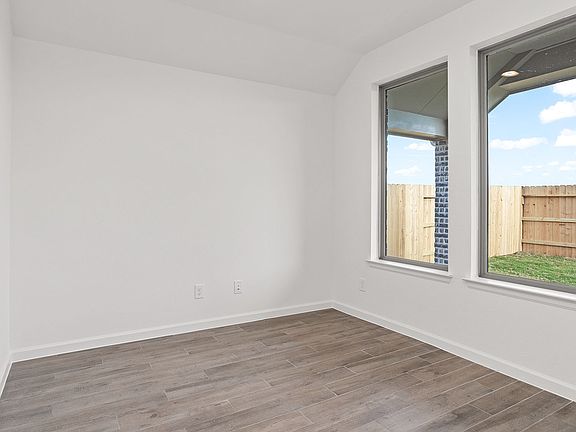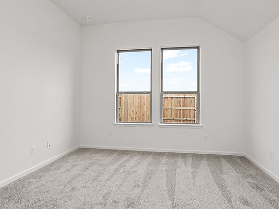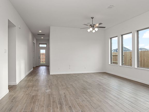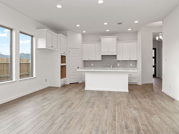 Entry with 11-foot rotunda ceiling leads to open kitchen, dining area and family room. Kitchen features a corner walk-in pantry and generous island with built-in seating space. Primary suite includes double-door entry to primary bath with dual vanities, separate glass-enclosed shower and large walk-in closet. Home office with French doors set at back entrance. Large windows, extra closets and bonus mud room add to this spacious three-bedroom home. Covered backyard patio. Two-car garage. Representative Images. Features and specifications may vary by community.