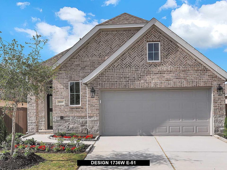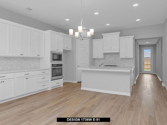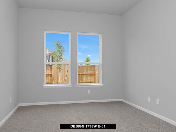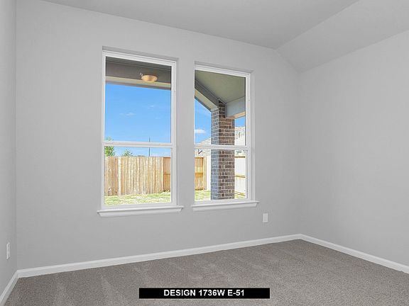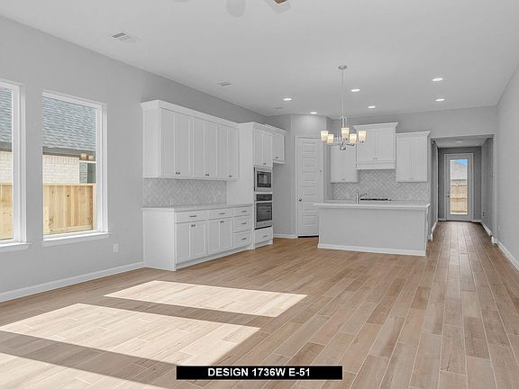 Entry leads to open family room, dining area and kitchen. Large windows and 10-foot ceilings throughout. Kitchen features generous counter space, corner walk-in pantry and large island with built-in seating space. Primary suite includes bedroom with 10-foot ceiling. Double doors lead to primary bath with dual vanities, separate glass-enclosed shower, garden tub and walk-in closet. Covered backyard patio. Mud room with adjoining closet is just off two-car garage.