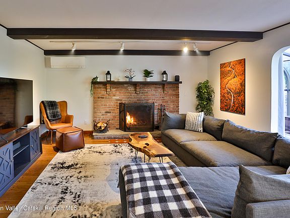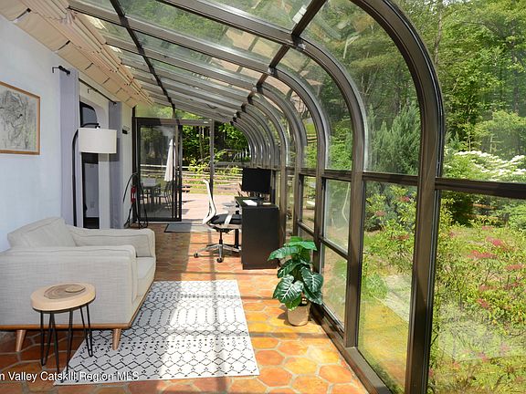 For those who are drawn to the unique and extraordinary and seek a daily feeling of being on retreat, look no further than this exceptional ''Mediterranean meets the Mountains'' move-in ready property. Imagine a hybrid of a mountain chalet and a Mediterranean-style villa with so much to offer including spa amenities, two handsome brick wood-burning fireplaces, an open floor plan, gorgeous wooden beams, and a stunning heated Florida sun room that is bathed in light, thirty-feet long with a balcony off of one end and entrance to the huge 28x28 feet deck off of the other. The outside is truly pulled inside to this marvelous space and it is infinitely relaxing. It is currently set up as a home office, gym, and lounge area. The recently renovated chef's kitchen is airy and bright and features brand new stainless steel appliances, a generous island. and even a beer fridge! The open concept floor plan will allow for seamless entertaining and the fireplaces in the living space and primary bedroom can pave the way for cozy and memorable fireside moments. Generous additional renovations can be found throughout the house, including the huge ensuite master bedroom with its sauna, and bathroom with steam room/shower with jets and a rain shower head. The guest bathroom was also beautifully renovated and both bathrooms have radiant heat in the flooring. There are also brand new mini-splits throughout the house for highly efficient heating and cooling, Heading down the custom built and beautifully crafted wooden spiral staircase (noted by this agent as uncommonly large and sturdy feeling for a spiral) you'll find a large finished space currently used as a game room with pool and ping pong tables and bar, but this floor could easily be repurposed if you need more sleeping space or maybe even a mother-in-law, as it has its own private entrance. Also on this level are the laundry room and the entrance to the two-car garage with an electrical car charger. Outside you'll find lovely seasonal mountain views, the ample deck, and a large level yard, recently fenced in, creating a wonderful dog run but also a great area to add your own garden or a pool. The 1.5 acre lot also features a private wooded area. Boiceville is a hamlet of low tax Olive, just 20 minutes from Kingston and Exit 19 of the NY Thruway. You're just .6 miles from the wildly scenic walking, biking, jogging and dog walking mecca the Ashokan Rail Trail, 10 minutes from Phoenicia and 15 minutes from Woodstock. A mere two hours to NYC. World class hiking, fly fishing and skiing are also close by. Right across the road you'll have access to thousands of acres of NYC-owned protected land that you can hike in if you obtain an (easy to get online) free permit. Speedy cable internet provides for excellent work from home options, which is very fortunate as you may rarely wish to leave behind the cozy comforts and peaceful surroundings of this special home.