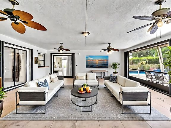 Ideal home for entertaining. The stone front facade offers superb curb appeal. The private back yard is a tropical oasis with an oversize 30x16 cobalt blue swimming pool with waterfall, contoured seating for 12 and built in table. The tropical pool is surrounded by a huge open multicolor paver deck measuring 58x38. There is 28x24 covered patio finished with 4 ceiling fans, 20'' neutral tile protected by 7 sets of accordion shutters. The kitchen features neutral cabinetry accented by granite counters w/ full backsplash, snack counter, SS Whirlpool appliances and built in pantry. Baths have been updated with granite counters, custom vanities and frameless shower glass. Ideal split plan with large bedrooms. Whole house generator. Garage has built in storage. Come see this upgraded home!
