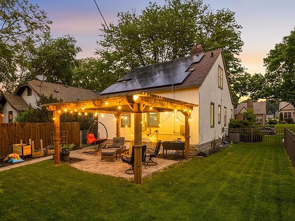 Tucked in a prime Hale location just moments from Minnehaha Creek, 5036 13th Avenue S is a 1927 Tudor-style bungalow that marries timeless character with eco-friendly updates. Hardwood floors, picture rails, and vintage radiators evoke the home's heritage, while a newer solar panel array and an ultra-high-efficiency Navien tankless combi-boiler elevate its performance for modern living and low utility costs. The main level includes two bedrooms, a formal dining room, and a quartz-topped kitchen with stainless appliances. Upstairs, the carpeted half-story features a spacious bedroom with a massive walk-in closet and a visible sewer stack - ideal for adding a future bathroom and transforming the space into a true primary suite. The unfinished basement offers epoxied floors and ample storage. Outside, summer living is effortless thanks to a custom-built wood pergola, backyard paver patio, and serene fenced yard - perfectly perched for enjoying glowing sunsets. Located one block from a Minnehaha Creek trail connection and surrounded by beloved neighborhood favorites like Sovereign Grounds, Heather's restaurant, Irreverent Books, and the Parkway Theater, this home is as connected as it is charming.