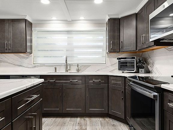 The only community on the Gulf that has a Private Beach! This stunning DREAM HOME is a 2 bedroom, 2 bathroom waterfront home offering over 1200 sq ft of meticulously renovated living space. There is honestly too much to list out but let’s try!!! As you arrive, you’ll notice the beautifully pavered driveway and walkway entrance replaced in 2022 including an elegant aluminum gated entrance custom designed to match landscaping and home. The home exterior radiates with fresh new custom stone work, fresh layered stucco and includes exterior rubberized paint to assist in low-maintenance of being a waterfront home. New gutters/downspouts. Everything has been updated from 2021 - 2022 including Roof, A/C & DUCT WORK, all plumbing re-pipped throughout home, NEW HOT-WATER HEATER, custom shower water filtration system, water softener, all new insulation blown into attic, brand new designer kitchen with custom cabinetry including soft close drawers, UPGRADED QUARTZ COUNTERS AND BACKSPLASHES, a custom island (oversized 7’x 4’) with Quartz top, Built in custom setting area as well as built in entertaining wall unit, all stainless steel appliances. BOTH BATHROOMS NEWLY RENOVATED, brand new custom cabinets with soft close drawers, one with custom walk-in shower, glass tiling backsplash, frameless glass door and upgraded Moen fixtures. The master bath has an exhaust fan with HEAT feature for those crisp day. Light kit includes built-in night light. The 2nd bathroom contains all upscaled tiling, an extra deep soaking tub, custom vanity and glass tiling backsplash. Brand NEW waterproofed vinyl planked floors consistent throughout entire home except bathrooms having custom tile. All windows and doors are brand new, enjoy custom hurricane impacted window guards which offer additional security with see through screening and one-touch inside emergency opening, custom hurricane roll down impact door for sliders, all windows inside have elegant roll down coverings, however the sliding glass doors coverings are automatic with a touch of a button….matching ceiling fans throughout, custom bead boarded wood ceilings throughout….Both bedrooms very nice size, one with office suite. Both closets finished with Closet by Design drawers and shelving. 2021 Installed Pool 14x28 goes to 6’ deep with upgraded Pebble-Tec coating and multifunctional lighting, extra large swim shelf can easily fit your loungers and swim out seat in the deep end. Entire yard is pavered to match the front, custom stone and lighting which runs around the pool edging..Custom lighting runs down the walkways from pool to water with beautifully decorated columns and custom aluminum fencing which matches the front. This leads to an entirely BRAND NEW oversized floating dock, walk out dock, 10k Boat Lift and 4K Dual Wave Runner Lift. All brand new electric, water and lights in this area as well. Again, our DREAM HOME but with unforeseen circumstances need to sell!!!!