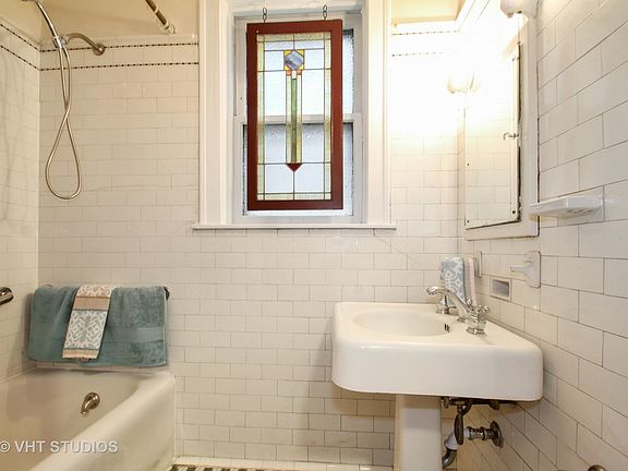 Beautiful oversized blond brick 2 flat features hardwood floors throughout, huge living room, dining room which leads to sun room with french doors, 2 large bedrooms and 1.1 baths on each floor. The building maintains beautiful architectural details including leaded windows, light fixtures and arched plaster entry ways. Rooms have been freshly painted. Basement is partially finished with 1/2 bath. There is a pretty yard which leads to 2 car garage. Garage is accessed through the alley. The driveway in the picture belongs to the neighbor. First floor has been occupied by the owner for many years and is now vacant. Second floor tenant will be moving by 1/31/19. Great location - walk to Park at the end of block, shopping and transportation. Exemptions: homeowner $729.00, senior $583.20 and freeze $5,708.07