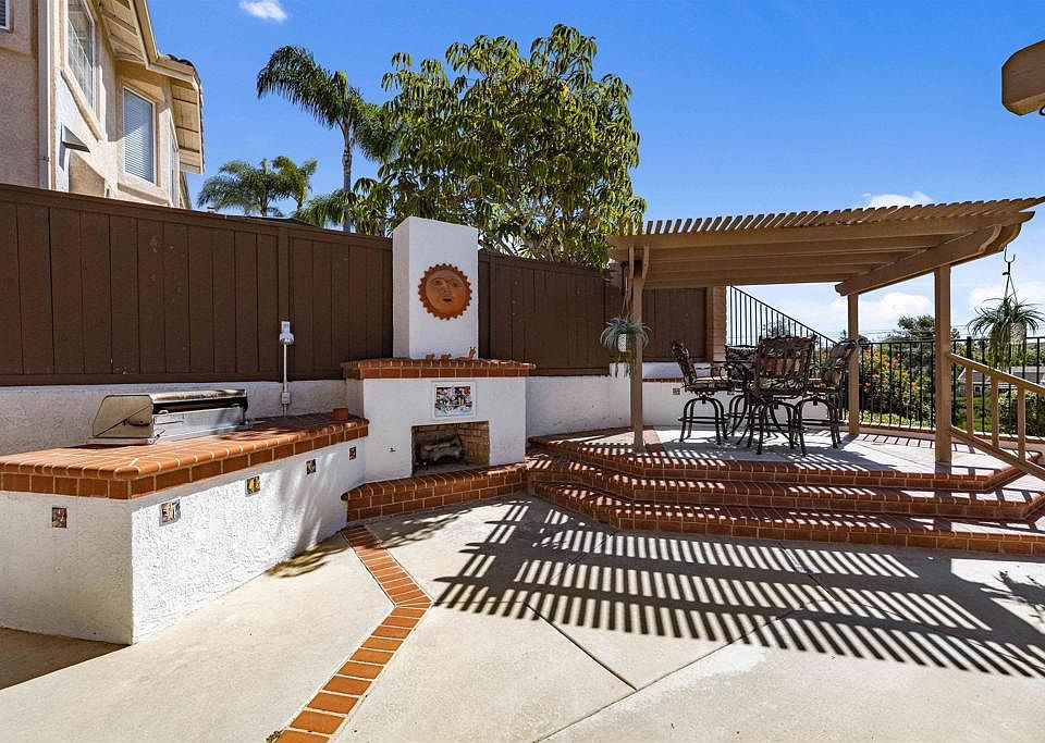 Welcome home! Situated in the gated community of Ocean Terrace, this spacious 4 bedroom, 3 bath, 2,676 sqft home defines the term "pride in ownership." I'm going to start listing features and you tell me when to stop. There is upgraded flooring throughout the whole home including laminate wood flooring downstairs and carpet upstairs. The kitchen was updated with stainless steel appliances, granite countertops, and custom backsplash. The entire interior has been painted with the addition of a custom built-in wine refrigerator. If you were wondering, the answer is yes...there is a convenient bed and bath on the 1st floor along with a beautiful fireplace in the family room. Using the custom stairwell, walk upstairs through the French doors into the spacious primary suite. Outfitted not with one, but two amazing closets, complete with mirrored doors and built-in organizers. Relax in the gorgeous Jacuzzi tub surrounded by a natural stone setting and bronze faucets. Do you want more? How about a balcony with views of the canyon and the ocean on a clear day? Should I keep going? Outside you will find that there has been extensive cement work done with in-laid brick and a short retaining wall. Practice your putts on the 3-hole putting green while using the built-in BBQ to prepare dinner. The outdoor fireplace and elevated patio with a gazebo, provide the perfect setting for entertaining! Wait...there's more. A newer landscape irrigation system, automatic landscape lighting, a spacious 3-car garage with a new opener, PAID OFF solar system installed in 2018, and a new HVAC system installed in 2020. You've read about it now come see it! Ocean Terrace / Spinnaker Ridge is ideally situated on the border of Carlsbad, with easy access to schools, parks, shopping, and golf.