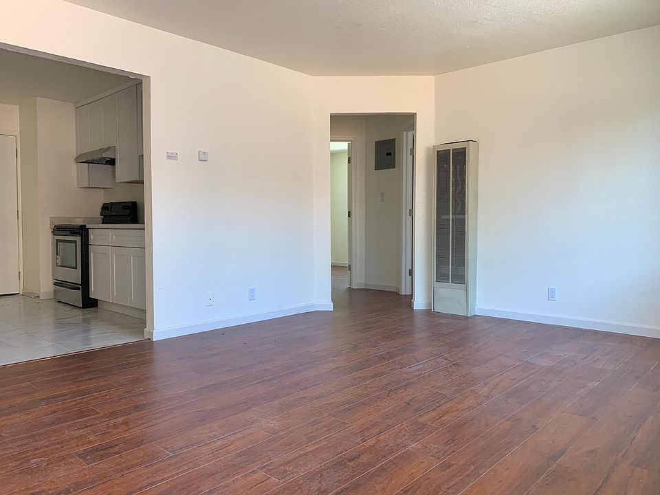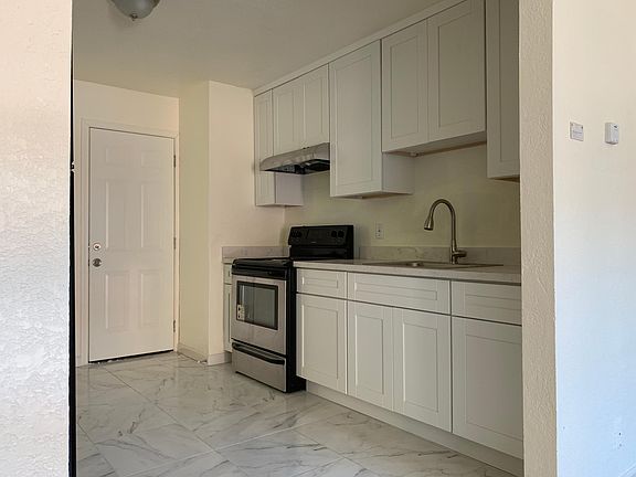 Newly remodel two bedroom and one bathroom in a quite neighborhood. Laundry set is on site. Two car parking spaces are in backyard. New hardwood floor with white baseboard New windows New kitchen cabinets New quartz countertop New marble kitchen floor New bathroom marble floor New bathroom marble shower wall New bathtub New vanity set New lightening One-year lease and Owner pays water