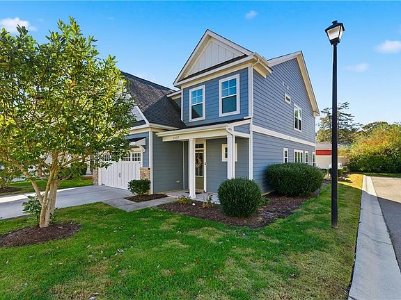 4-bedroom, 2.5-bath home situated on a corner lot with cement board siding and modern coastal design. The first floor includes an open-concept layout with cathedral ceilings in the living area, a dining space, and a kitchen with stainless steel appliances, large island, and pantry. The primary suite is located on the first level and features a walk-in closet, double-vanity, with a soaker tub. The second floor offers three additional bedrooms, a full bath, and a flex space over looking the living area, suitable for an office or additional living area. The low maintenance exterior features include a trellis-covered patio, fenced yard, and two-car garage. Conveniently located near Little Creek base, Dining and beaches.