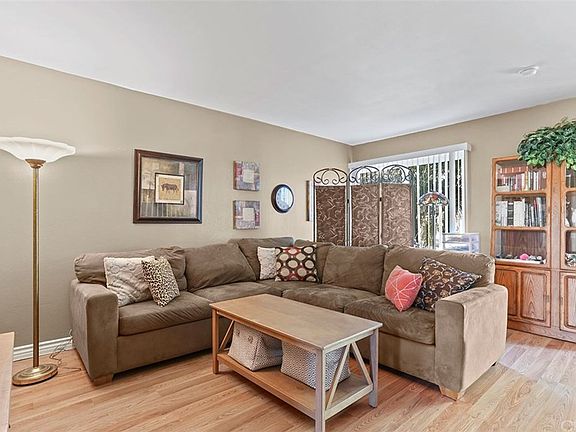 Breezy and beautiful - this 2 bed/1 bath townhouse is open and charming. The floor plan allows for a seamless flow from the front door into the kitchen. Laminate floors cover the living room, creating a natural barrier from the tiled kitchen and dining area. There is ample cabinet and counter space in the kitchen, as well as direct access to the spacious patio. Windows in the living room and kitchen usher in plenty of natural light to brighten the whole space. The partially covered patio offers privacy and enough room for various outdoor activities, from gardening and landscaping to cooking and dining. Both bedrooms are upstairs and feature carpeted floors, generous closet space, and large windows. The master bedroom is roomy and cozy, with mirrored closet doors and an attached bathroom. There is additional storage space with built-in closets in the hallway. The other bedroom is versatile and could be ideal as a home office or workout room. Other amenities for this lovely townhouse include central AC and heat and a dedicated covered parking space. The complex offers a community pool and an aesthetically attractive living environment with fresh, tailored landscaping.