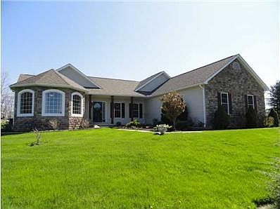 Fantastic almost new ranch on 2+private acres. Custom built featuring an open floorplan with vaulted great room, pecan floors, designer kitchen with built-ins appliances, formal dining room and den/4th bed, and a huge 9' full basement. Gorgeous pond with waterfall accents the backyard. Treeline and privacy abounds.