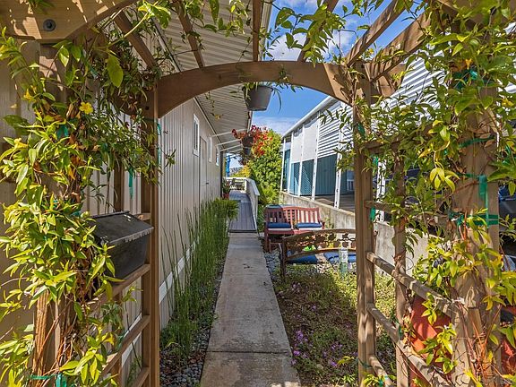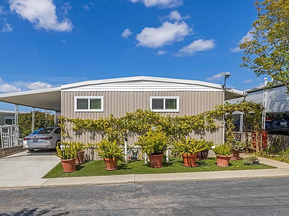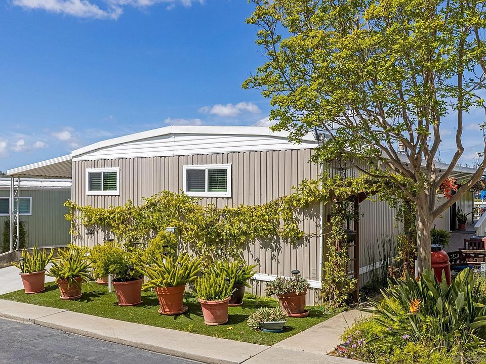 Move in Ready with a View! The location is just minutes from Kaiser, Costco, Dining, Grocery Stores and Freeways in The Cliffs Senior Mobile Home Park. Almost 1400 sf overlooking Mission Gorge and Admiral Baker Golf Course. Exterior features ramps at both entrances, a huge deck surrounded by fruit bearing trees and shrubs, a two-car covered carport, with new concrete driveway, shed, and covered entry. Newer whole house air conditioner. The definition of open floor plan includes, new soft close kitchen cabinets, pantry pull out drawers, LED lighting, upgraded appliances, and fixtures, all new windows and doors, beautiful laminate flooring and luxury carpeting. Bathrooms have been upgraded with new fixtures and lighting. All appliances convey including the washer, dryer, and refrigerator, plus NO property tax, home is on annual registration. (AAF8654)