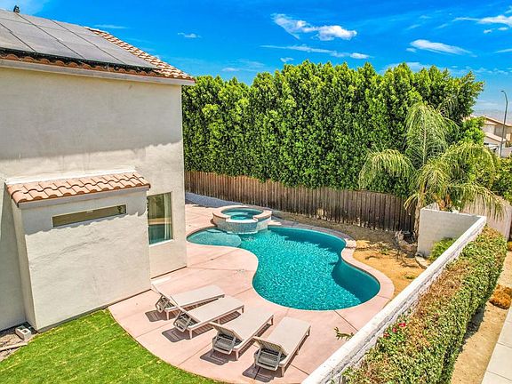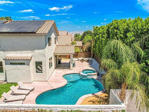 This exquisite, renovated residence is one you will want to see. Situated on a corner lot with owned solar not leased this home was recently revamped from floor to ceiling. Luxury vinyl plank flooring throughout, modernized kitchen and bathrooms, fresh paint, and more. The expansive yard includes a new pebble-tec-pool and spa, covered patio and fire pit, perfect for hosting gatherings with family and friends. Additionally, this property includes a guest Casita with a private entrance, ideal for accommodating visitors. Close to the polo fields and other great amenities the desert has to offer.