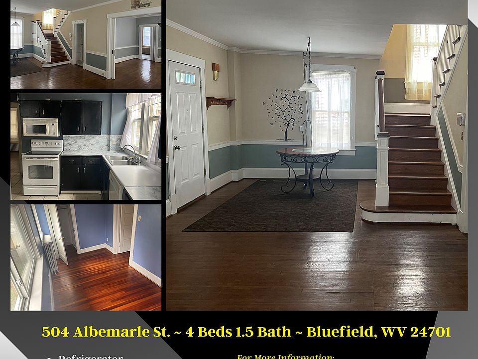 504 Albemarle St. ~ 4 Beds 1.5 Bath ~ Bluefield, WV 24701 LEASE OPTION ONLY (Path to Home Ownership): Initial payment: $5,000 with no payments due until the 1st of the following month! Monthly payment: $1,150/month. No utilities included. Sorry, this home is not HUD approved. Are you looking for lots of space & a lot of bedrooms if so, this house is definitely what you are looking for Oversized three-story, four bedroom one and a half bath house for rent. The main level features an oversized living room, half bath for guests, laundry room, access to the back deck. Formal dining room in addition to another room off from the kitchen that can be used as a breakfast nook or walk-in pantry. Kitchen features a dishwasher, stove, refrigerator & an over the range microwave. The second level has all four bedrooms and a large full size bath with linen closet in the bathroom as well as in the hallway. The third level is a large oversized attic that could be used as an additional room, play room, office, etc. Hardwood floors, high ceilings & ceiling fans throughout. Extra closets with plenty of room for storage. Full size basement with lots of room for storage, extra sink for canning, or additional washroom area. This home has a lot of charm & too many extra to list. Some of the features include a large, flat, fenced in backyard with back deck perfect for grilling. Two electric heat pumps so that each level of the home can be controlled at different temperatures in the summer & winter. Covered front porch. Paved two car driveway. Christian Management Corporation Office Hours: Mon-Fri 9:00AM-5:00PM & 10:00AM-2:00PM the 1st Saturday of every month You can view THIS property 7 days a week! Most pets welcome with a $300.00 pet fee per pet and signed pet agreement. Maximum 2 pets. No aggressive breeds due to insurance restrictions. Clean, safe, quiet, crime & drug-free are our priorities for our residents! We support Equal-Housing Opportunities! Good people with good, bad, low, or no credit but stable employment or Social Security are welcome. -MUST pass background check -NO evictions in the last 7 years -NO sex offenders Is this property not what you are looking for? View our other available #homes, #mobilehomes, #apartments, and more on our Facebook or our website!