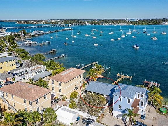 Exceptional views of the Intracoastal Waterway from this hidden gem! Tucked away on a quiet street. Views of the water from every room give you the feeling that you are on a boat rather than land. This unique property offers 4 BR and 2 BT- that can be used as two separate apartments each with its own kitchen & living spaces. Deep water dock to keep your boat or to fish and relax. Perfectly situated just a short block (1 minute walk) to the beach. Spectacular views of the Cortez Bridge, Historic Bridge Street Pier and Clock Tower. Watch gorgeous sunrises or twinkling lights at night. Updated kitchen downstairs with solid surface counter tops & stainless appliances. The open bay-side deck and lower level patio are great entertaining spaces. Selling with some basic rental furnishings (Antiques do not convey). New A/Cs installed in 2018. New roof 2017.