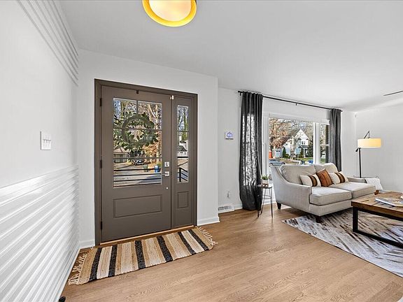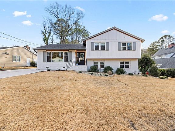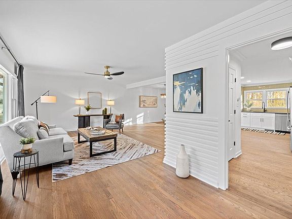 Totally renovated mid century modern home just minutes to North Hills, offering hardwood floors throughout, no carpet, and a flexible layout with bonus and entertainment space. 504 Dartmouth delivers style, function, and location, starting with eye catching curb appeal including a custom mailbox, updated front porch handrail, stained accent ceilings on the front and back porches, and a new front door. Inside, custom accent trim in the foyer and living room, new fans throughout, and a spacious dining room with a custom chandelier set the tone. The updated kitchen features new countertops, designer backsplash, floating shelves, stainless steel appliances, pantry, and convenient access to the back entrance. The main level hall bath has been fully renovated with new vanity, toilet, lighting, tile floors, tub surround, countertops, and gold accents. The owner's suite includes a custom accent wall, backyard views, and a spa inspired bath with dual vanities, matte black finishes, new mirrors, updated tile, and a frameless glass shower. The lower level offers an additional bedroom and a full bonus or entertainment space with built ins, painted brick accent wall, and fireplace, ideal for a media room or pool table, plus an updated laundry room with sink and sliding glass doors leading to the lower concrete patio. Outdoors, enjoy a fenced backyard with fresh landscaping, custom walkway, and a storage shed, all in one of Raleigh's most convenient locations near North Hills.