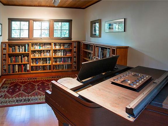Remarkable modern contemporary with redwood ceilings and first-floor master suite sited on a majestic acre lot in the walkable community of Bradford Woods.The stone pathway + deck lead to a glass-door entry + main level featuring multiple living spaces with hardwood floors, an abundance of large windows, skylights, and doors leading to a private wrap-around deck and yard. The first-floor master features a cherry-ceiling bath, sitting area + deck access. The living+dining room provide an open space for school or office work. Craftsman-style built-ins in the music room. The galley kitchen, with tin ceiling, opens into a breakfast nook + family room with two-story ceiling, gas fireplace and spiral staircase to lower-level home office with separate entrance. The upper level has 2 bedrooms with floor-to-ceiling windows, parquet floors, a hall bath. The outdoor living area + deck has a fountain, a large back and side yard with mature trees+ 2 detached garages. A nature lovers delight.