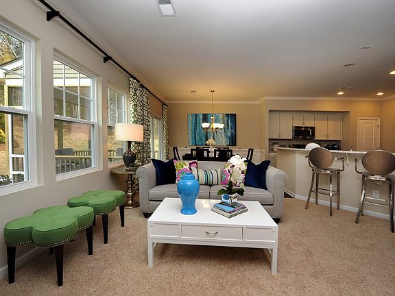A soaring two story foyer with an open staircase welcomes you into this beautifully designed home! The Lenox features a large kitchen with bar seating that overlooks the generous family room and dining room. Stunning two-story foyer in LENOX home decorated with wrought-iron open stair rail. HARDWOOD floors throughout 1st floor. OPEN Kitchen with granite countertops, tile backsplash & under-cabinet lighting. Relax on SCREENED PATIO backing to tree buffer. Master suite offers enough space in bedroom for desk or sitting area, TILE SHOWER walls and spacious vanity in bath. Upstairs laundry, 9' ceilings, 2 -car garage, community pool, easy access to RTP/airport.