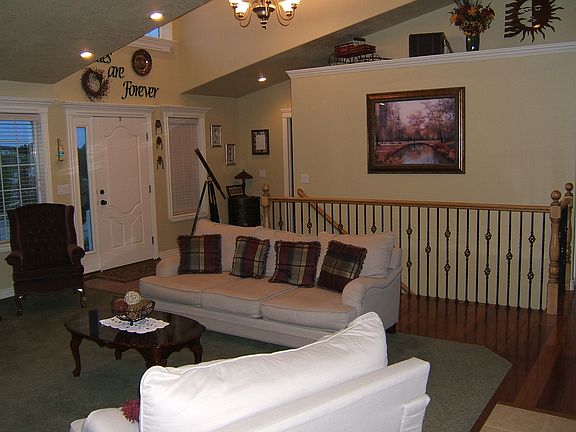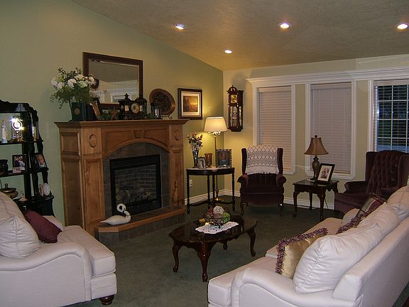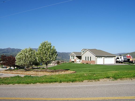 Country Home, 1.88 Acres This home features five bedrooms with three full baths, fully finished basement. Upstairs has an open floor plan with a vaulted ceiling. Downstairs has a roomy nine-foot ceiling. The home includes a master bedroom suite, master bath, jetted tub, and separate shower. The kitchen features granite counter tops and stainless steel appliances; pantry, tile floor with hardwood in the dining area. Forced air propane furnace, air conditioning, and gas fireplaces upstairs and down. Downstairs includes a large family room and recreation area with a separate theater room. Landscaped yard, sprinkler system, deck with hot tub, mountain views below Pebble Creek Ski Area, 3 car garage, paved driveway, 12 X 20 mini-barn with loft.