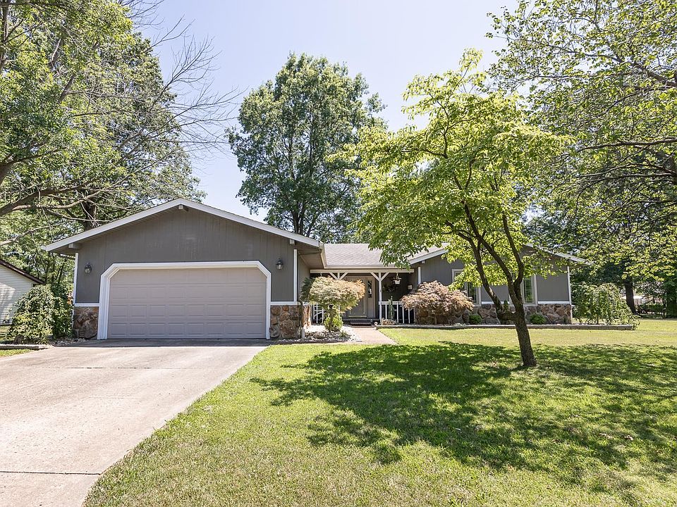 THIS OPEN FLOOR PLAN RANCH HOME IS LOCATED IN WOLF BRANCH SCHOOL DISTRICT AND OFFERS A SPACIOUS LAYOUT! Offering three bedrooms, two full baths and a large kitchen, there is plenty of space if you are just starting out or even looking to downsize. The beamed, vaulted great room features a stone fireplace with wood mantel and is open to the large breakfast nook. The kitchen has a breakfast bar, ample pantry space, solid surface countertop, tile backsplash and all appliances that are included. Washer/dryer is negotiable. All three bedrooms are ample sized, and the master suite features a 2nd fireplace plus a barn door to the remodeled bathroom. Round out this great home with a great backyard that has a brick patio, pergola and shed for all your yard tools. The exterior was also freshly painted and there is a covered front porch to enjoy your morning coffee. Crawlspace encapsulated as well! Must see!