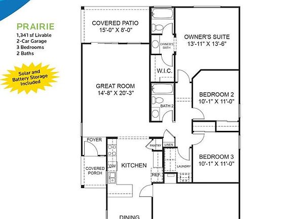 The Prairie at The Traditions at Mountain Gate is beautifully designed for energy efficiency, comfort, and durability. Every detail of this 1,341 square foot floor plan has been thoughtfully considered. The spacious Great Room is perfect for entertaining and extends out to the patio with a variety of sliding door options. There are plenty of design options to make Prairie your own, from a ideally appointed gourmet kitchen, to the tile in the beautiful owner's bath. The Prairie starts at 1,341 square feet, 3 bedrooms, 2 baths, with a 2 car garage.This Prairie floor plan comes with solar and sonnen energy storage included.
