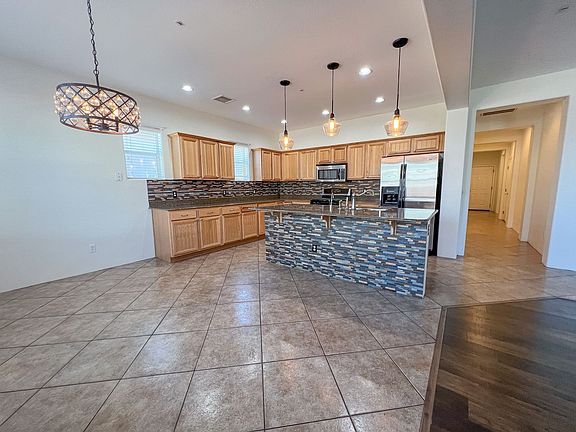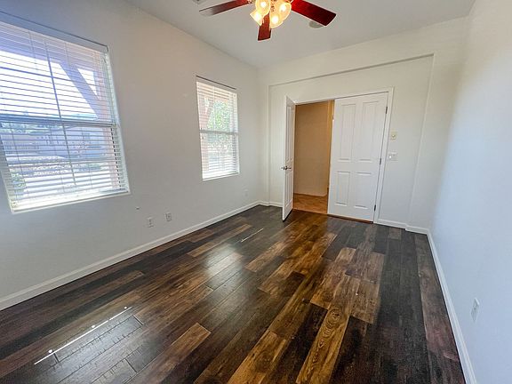 This modern single-level home features an open floorplan with 2 bedrooms, 2 bathrooms, plus a den with double doors. Kitchen with large breakfast bar, granite counters, tile backsplash, gas range, dishwasher, and a dual-door refrigerator with an in-door ice/water dispenser. Primary bedroom with en-suite offers a spacious stand-up shower, a dual sink vanity, and a walk-in closet. There are ceiling fans in the living room, both bedrooms, as well as the den and updated light fixtures throughout. Laundry room with front load washer and dryer. Water softener. Attached two-car tandem garage. Fenced yard landscaped with low maintenance artificial turf.