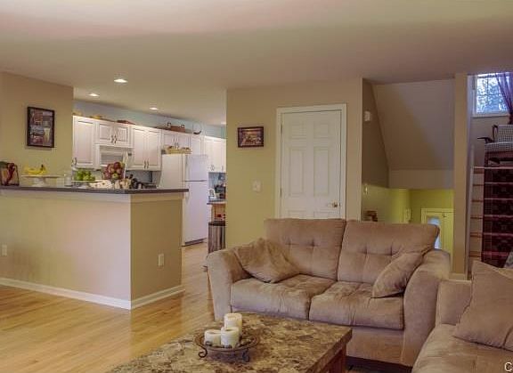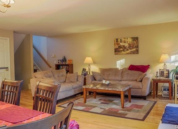 Come see this beautiful, conveniently located townhouse. Open floor plan on main level features HW floors, gas FPLC, HB, and elevated deck - perfect for grilling. Corian counter tops, slide-out shelves, pantry, breakfast nook w/ bay windows in kitchen. Carpeted upper level w/ washer/dryer behind folding doors. MBR has vaulted ceiling, WLKIN, and FB with 2 sinks. 2nd BR has FB, and beautiful bay windows. Bonus room on lower level w/ bamboo floor, walk out patio access to large green-space. Largest model in development, less than 70 yds from club house, exercise room and pool. Location and landscaping provide lots of privacy. Close to food, shopping, exit 2. NOTE: HOA fees include water and sewer.
