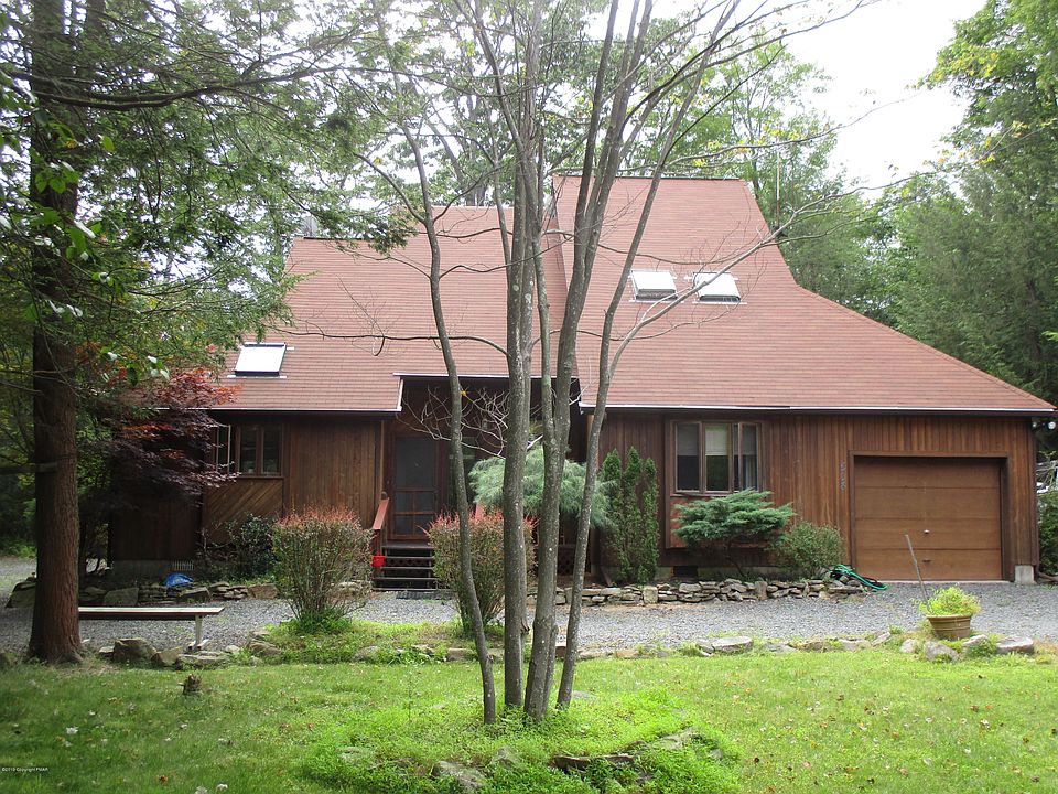 UNIQUE HOME! OPEN CONCEPT LIVING! Located in beautiful Pocono Farms Country Club. It boasts a beautiful master bedroom with its own fireplace and a fabulous whirlpool-equipped master bath. First floor has a beautiful kitchen that overlooks living, dining, and porch areas so that cooks can be part of the family! Home features 3 separate outdoor living areas, a front porch for sitting and relaxing, a side porch for privacy, and a huge deck for sunning. There are 2 fireplaces-one in the master bedroom and one in the living room, a loft, a garage, a shed, 3 bedrooms, and 2 baths. All of this is located on a wooded cul-de-sac in a community that offers golf, tennis, an Olympic size pool, a lake, a beach, a club house with a restaurant, a soccer field, bocce, and more.