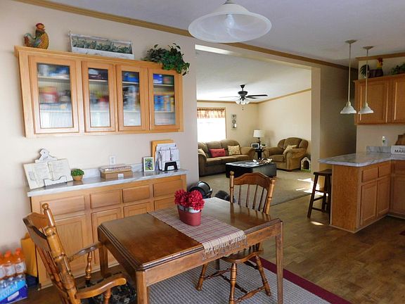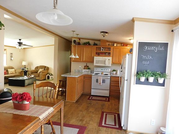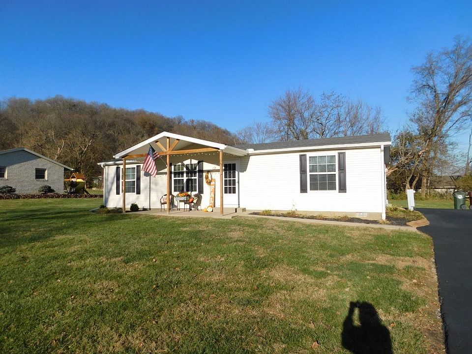 Wouldn't this be a wonderful HOME FOR THE HOLIDAYS! Immaculate, Tastefully painted, decorated & such a great feeling to either sit in the kitchen, dining area or living room yet you can choose to grill on the back patio just out the kitchen patio doors or sit on the front porch and wave to the neighbors. This home is in a desirable neighborhood in Vevay, IN and offers 3 bedrooms with lg. closets, 2 full bathrooms, open kitchen/living/dining area, hallway door to Master bath includes laundry area & door leading to the blacktop drive. Sidewalk, Garage with car shed is perfect for storing mower/yard/gardening tools. Roof practically new and low utilities. This manufactured home is going to sell quickly and qualifies for all manufactured home loans. Possession will be very soon after closing so no delays and if you're a cash buyer we may be able to get you in by Christmas! Please don't hesitate to take a look.