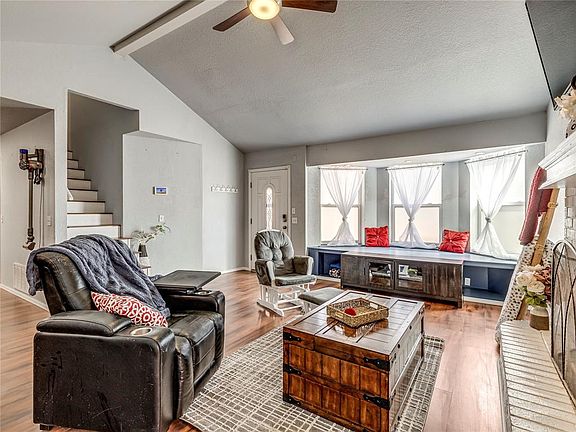 CHARMING REMODEL! 4 BED/ 3 BATH/ 2 CAR GARAGE. 2 MASTER SUITES: UPSTAIRS HAS 2 BEDROOMS W/ ADJOINING BATH, LG COUNTER W/MAKEUP BAR AND SKY LIGHTS SECOND BEDROOM FOR STUDY OR BABY ROOM, PERFECT FOR A 2ND MASTER SUITE. LAMINATE FLOORS THROUGHOUT W/TILE IN BATHROOMS AND KITCHEN. FAMILY RM HAS VAULTED CEILING, FAN, BAY WINDOW W/BUILT IN STORAGE, FIREPLACE, OPEN TO KIT & DINING. KIT HAS BREAKFAST BAR, TONS OF CABINETS & COUNTER SPACE, GLASS TOP STOVE/OVEN, MICROWAVE, LG PANTRY & FORMICA COUNTER & BACKSPLASH. DOWNSTAIRS IS 1ST MASTER SUITE W/ FAN, FULL BATH AND WALK-IN CLOSET. 2ND DOWNSTAIRS BEDROOM: FAN, DOUBLE OPEN CLOSET. NEW ROOF W/DECKING IN 2022, HVAC SERVICED IN 2023 (FREON ADDED, NEW CONDENSER AND REWIRING), EXTENDED DECKING IN ATTIC, AND STORM SHELTER IN GARAGE. LG BANK YARD: SPRINKLER SYSTEM (FRONT AND BACK) SIDE COVERED PATIO, GATE TO FRONT, STORAGE SHED, PARTIAL NEW STAINED FENCE. HAS SECURITY SYSTEM, WELL GROOMED QUIET NEIGHBORHOOD W/ WALKING & LAKE. CLOSE TO I-35, MINUTES FROM SHOPPING & RESTAURANTS AND COVETED NORMAN SCHOOLS. REFRIGERATOR, WASHER AND DRYER WILL STAY WITH THE HOME. A ONE OF A KIND, OFFERS SO MUCH FOR THE PRICE!