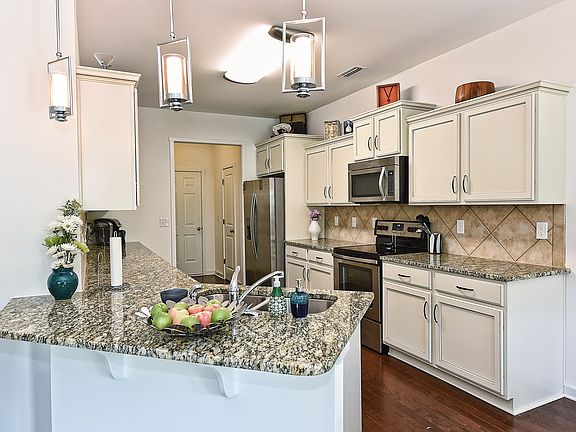 Like new and move in ready! You will LOVE this floor plan! Open floorpan downstairs w/simply gorgeous kitchen, granite counters w/matching ceramic tile backsplash & decorator lighting, stainless appliances. Dining room off of entry can be flex space (office, second den, etc.). HUGE master bedroom w/walk in closet, granite counter master bath. You will love top of the stairs loft which can be bonus room, office, media room, etc. Corner lot w/2 car garage, Community pool & clubhouse. Hardwood floors in entry and kitchen!