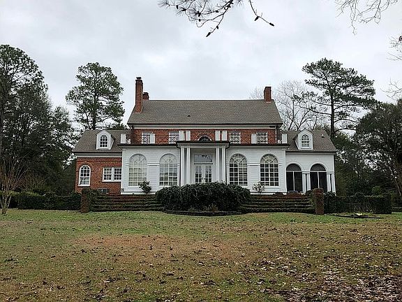 Elegant historic family home, 5 bedroom, 3.5 bath, with detached garage with upstairs (possible income earning) studio. 3 acre lot with pond. Historic home built 1933, designed by prominent Columbia architect of the time, Willis Irvin. Kitchen renovation in 1960s with French Provincial theme, pine plank “Hart” pine wood floors, ceiling beams, brick accents. Kitchen has 1/2 bath and mud room with closet housing stacked washer/dryer. New addition to rear of house with large gallery 1990, interior columns and vaulted ceilings, wrap around slate porch deck with 3 entry French doors, makes a nice area for entertaining or family gathering, with wet bar and granite counter tops. Elegant entry way features marble tile floor and stairwell, small chandelier ceiling fixture. Most door hardware is original, working brass. Features 7 working fireplaces. Basement central area with crawl space, concrete storm shelter. Hardwood floors. Basket weave ceramic tile (2) bathroom floors. Master bath with 2 walk in closets. 3 of 4 upstairs bedrooms with fireplaces. Carolina room, screened, with porch swing, off living room. Garage has upstairs studio with kitchenette, bath with shower, private entry and separate utilities, features screened window skylight for art studio use. Garage has downstairs 1/2 bath, storage. Outside lawn and garden with extensive mature perennial flowering trees and varieties. Camellias, Magnolias, Crepe Myrtles, Pecan, Oak and Pine trees. Stable residential neighborhood. Circular gravel drive (0.1 mile) with ample parking for guests. Located 5 minutes from Carolina Pines Regional Medical Center by car via Rt. 151, one block off highway via Westover Drive.
