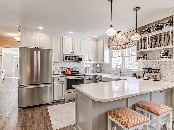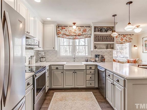 Fully renovated 5BR/3Bath Ranch on 3.5 acres backs to 358 acre federal preserve. Wake Co. Schools, No city taxes, no covenants! Open family room and kitchen, formal dining/living room, large bonus w/side entrance. Covered front porch with porch swings and outdoor fans. Lg. deck w/wooded views in back. Walk up attic structurally ready to be finished for additional sq. ft. Three miles from 540 access, to work in 10 minutes in RTP, and come home to the country! Fifteen minutes to Southpoint Mall. Five min. to Beaver Creek Commons for dining and shopping!