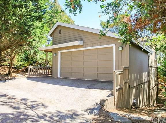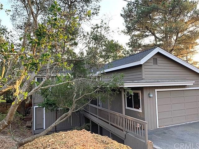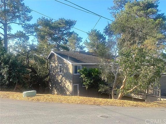 Private Corner home on Happy Hill is tucked in among the trees. First time on the market in many years, this home has a large living room with a wood burning fireplace w/slate surround, vaulted ceilings and clerestory windows bringing in extra light. The living room is open to the dining area with a pass-through area to the kitchen. A long deck can be entered off the dining area and runs the entire length of the back of the house.This deck is south facing, connects to the master bedroom and there is a peek-a-boo ocean view through the trees. The kitchen has lots of cupboards and slate floor with a charming corner sink. There are three large bedrooms in the home, one on the main level and two downstairs. Each floor has a primary bedroom with a full bathroom and walk-in closet. The upstairs primary bedroom has access to the back deck. The downstairs bedrooms also have a full deck that runs the entire length of the home. The third bedroom has a built-in desk area. It also has a full bathroom but is not directly connected with the bedroom. There is an inside laundry room w/cupboards and includes the washer and dryer. This home has lots of extra closets inside and outside. Underneath the 2 car garage is lots of storage space for tools plus theres an outside storage closet easily accessible from the lower deck. This home has new exterior and interior paint and new carpet. The west village of Cambria and Moonstone Beach are a short distance away.
