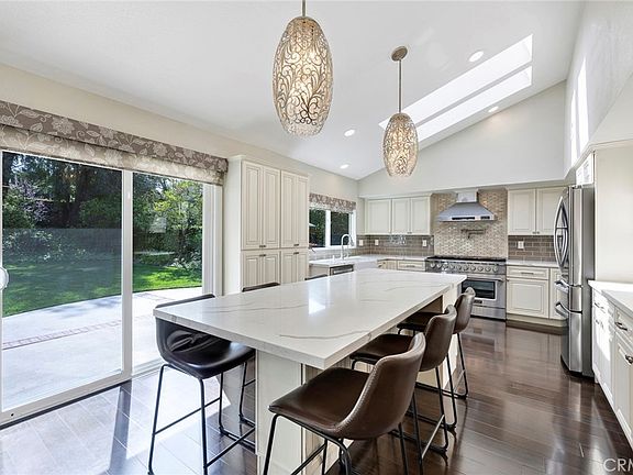 YOU ARE GOING TO LOVE THIS STUNNING YORBA LINDA HOME!! A 4 bedroom, 3 bath house tucked away on a quiet, tree lined cul de sac and is just a quick walk to top rated Travis Ranch school. One large bedroom and full bath is located downstairs. From the moment you set foot into the house you will notice the attention to detail to each and every room. Beautiful wood laminate floors have just recently been added downstairs. The living room features cathedral ceilings, recessed lights, lots of natural light, a custom fireplace with stacked stone, wood mantel and charming light sconces. The formal dining room has a sliding glass door which opens to a patio space on the side yard. The kitchen has just undergone a complete remodel and is gorgeous! The large island seats 6 and additional storage has been built in to the island, along with electrical plugs on both sides. Custom soft closing cabinets and drawers, quartz counter tops, gorgeous pendant lights, high end appliances featuring an 8 burner gas cook top and a double oven range, LG refrigerator with a convert drawer that can be used for a double freezer, built in microwave drawer, farmhouse sink, subway tile backsplash, and a pot filler complete this space. The family room is open to the kitchen and features 2 sliding glass doors that open out to the backyard. Both doors have custom window coverings. All bedrooms upstairs feature recessed lighting, custom window coverings, & large closets. All bathrooms have been updated with granite counters, glass shower enclosures, recessed lighting and newer fixtures. A well thought out home office has been added downstairs by converting 1/2 of the 3rd bay of the garage making a desirable space that has direct, easy access to both the house and the garage. A 240V outlet has been added in the garage for electrical vehicle charging. The large park like backyard is quiet, and serene with a spacious grassy area, lush landscaping, mature trees, a gas line for a BBQ, all which provide the perfect backdrop for fun backyard activities. In addition, the surrounding neighborhood has two parks nearby, walking trails to enjoy, restaurants, boutiques, a bakery and more all within walking distance. There is just so much to love about this house, it must be seen to fully appreciate!