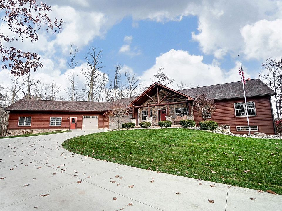 Peace and privacy abound in this 4100+ sq ft home on nearly 25 acres. This nature lover's paradise includes mostly wooded acreage, a 1 acre stocked pond, and a large stick built barn. The main floor of the home features an open concept living/dining/kitchen, a stone fireplace, quartz counters & custom hickory cabinets, hardwood floors, a master suite with tile walk-in shower, a large laundry room, a 2nd bedroom, a mud room w/ lockers, and an 800 sq ft flex room of the garage. Flex room has its own entrance and would be a great spot for a home business, workshop, entertaining space, or workout room. In the basement you will find heated ceramic floors, a large family room w/ pool table that stays, 2 more bedrooms, a den, a kitchenette, and a full bathroom. The home features a central vac system, a brand new roof (Nov 2020), geothermal forced air, Andersen windows, a walk-up attic, and a 3 car attached garage w/ a wood stove & full bathroom. Out back you will find a covered hot tub space (hot tub included), 2 patios, a fire pit, and a deck... all overlooking the beautiful views of the pond and woods. The professionally maintained pond has a depth regulator, an aerator, and is stocked with bass, bluegill, catfish, and sunfish. The east side of the property holds every man's dream barn. The 3024 sq ft barn is stick built with 5 overhead doors (all with openers), a separate well, a wood stove, epoxy floors with drains, and is completely spray foam insulated. You really have to see this property to truly appreciate it, so schedule your showing today!