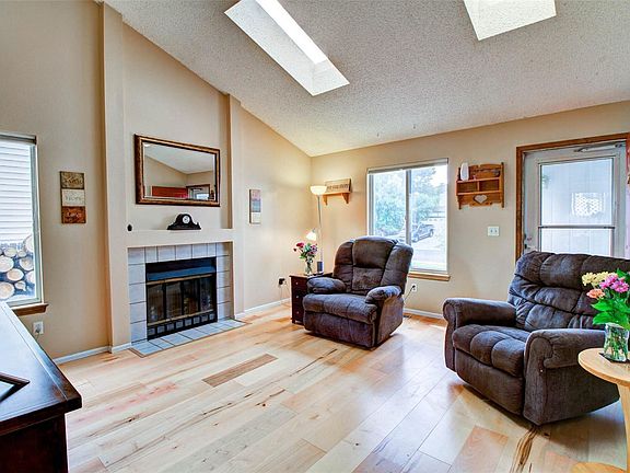Cozy 3 bedroom home in Woodglen. Enter into the beautiful living room with vaulted ceilings, 2 skylights & new wood floors. You can light a fire on chili nights in the wood fireplace. Kitchen is an open concept/country style kitchen with vaulted ceilings. Plenty of room for your dining table. All kitchen appliances are included. Master bedroom is in the back of the house & has a big closet. Second bedroom has built in shelves, large window & a ceiling fan. Full bath on main level. Downstairs has a large room, great for family room, game room or could be 4th bedroom. It has an egress window. Bedroom #3 is in lower level with 2 large closets & 3/4 bath across the hall. Laundry room with built in shelves. Oversized garage with storage shelves & workbench and 220 outlet. Raised garden & shed in back yard. A/C unit & Swamp cooler (1 yr old). Walking distance to elementary school. Close to Cherry Park, trails, shopping, greenbelt & new light rail being built close by. New Roof coming soon!