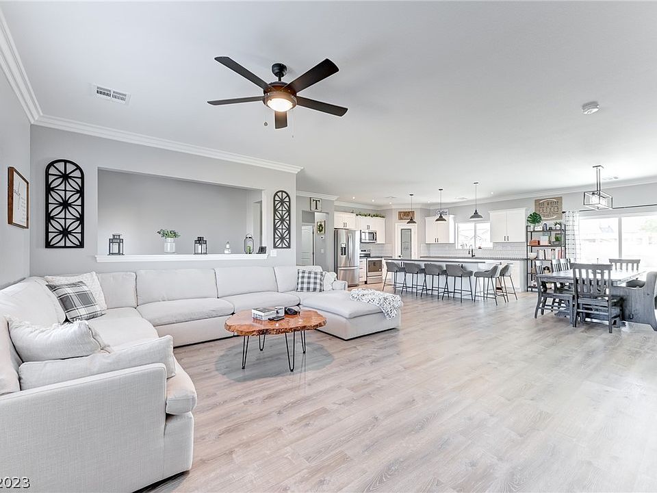 Gorgeous Corner Lot Custom Home built 2022 . This Beautiful Property is 2057 SQF with an open floor plan which includes 3 Large Bedrooms, With 2 Primary Bedroom, 3 Car Garage, Front Covered Porch, Covered Patio, RV Parking with hookups and an oversized lot. Home is fully upgraded featuring Custom Cabinets in the kitchen and all bathrooms, Quartz Countertops, under mount sinks, oversized kitchen island with cabinets on both sides, Pantry, New Stainless Steel Appliances, , 5 1/2 inch modern baseboards, crown molding in living area, LED lightning, Ceiling Fans, Custom shelving in the master bedroom closet, Vinyl Flooring all around, laundry room with a sink/cabinets and so much more. The Property is Fully fenced, RV gated and located in the heart of Artesia at Hafen Ranch the one of the most highly desirable custom homes community in Pahrump. Close to SR 160.