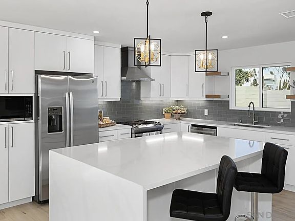 Stunning modern 2023 rebuild plus addition, all fully permitted. Truly gorgeous chef's kitchen, 7ft. quartz waterfall island and custom wine cabinet to entertain family or friends. Or relax in an exceptional master suite, spa inspired bathroom, artistic tile décor, touch mirror lighting, double floating vanities & huge walk in closet. Everything is NEW, there is no honey do list at this home! Close to UCSD, schools, parks, trails, beaches, shopping and restaurants. This centrally located single level GEM has it all, a wonderful property to call HOME. EZ living, with all new appliances, designer lighting, HVAC/Bluetooth thermostat, tankless Rinnai water heater, plumbing, electric panel plus upgraded gas meter. Spacious separate laundry room/8x5, dual pane windows, sound proof insulation, attic storage with excellent metal ladder access and new roof. LVP flooring, mirrored closet doors in the bedrooms. The 8ft sliding door from the master suite leads out to a huge back yard with custom stamped concrete. This large 6000 sq.ft. lot has great ADU potential or room for a resort style Pool. The thoughtful design and modern layout invites relaxation and entertainment year round.Great price adjustment as well!