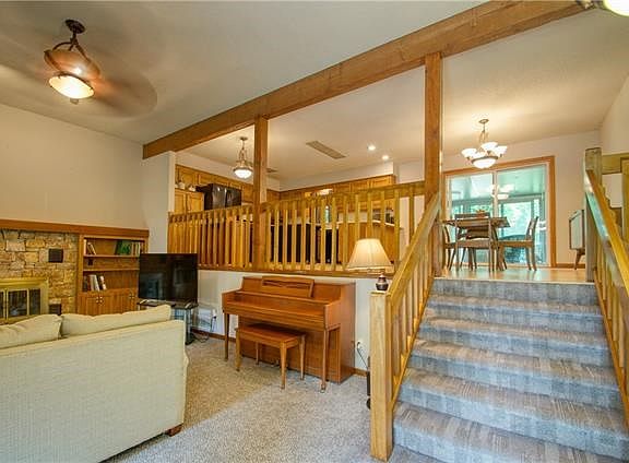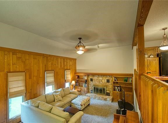 Open living space! 3 bedrooms (on 2nd floor) plus 4th non-confirming bedroom in lower level. Master suite with new carpet, private bath and walk-in closet. Kitchen with peninsula, dining area, and access to sun room. Cork flooring in kitchen and hall area. Lower level features 4th bedroom/office, rec room/playroom (currently used as home office), wet bar, half bath and laundry in hallway. 2 car attached garage and fenced backyard with pond. There is lots of yard beyond the Koi pond with waterfall. Spacious living room with vaulted ceiling, new carpet, fireplace and built-ins. HVAC and Water Heater - approx 5 yrs old. Roof - approx 3 yrs. Stove, kitchen refrigerator (stays with home) and dishwasher new within 5 yrs. Great space! (Koi fish already have a new home and will not be staying).