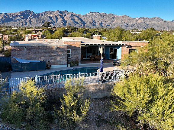 Views galore! Breathtaking panoramic views of the city and mountains from this beautiful 5 plus acre hill top lot with direct access to the Loop and Rillito River. This classic Lewis Hall designed and built burnt adobe home exudes warmth and charm. Walls of windows that frame both mountain and city views, beautiful signature high beamed ceilings in living room. Open kitchen with silestone counters, SS appliances, open to spacious dining area with fireplace. Spectacular views fromliving room with multiple sitting areas and fireplace to enjoy the views. Separate guest wing. Great south facing city view backyard with heated pool and hot tub. Access to horse stable and The Loop on a trail from the back yard. 2 HVAC systems replaced in 2022. Dual pane windows. Newly repaved driveway. Seller never used fireplaces and do not warranty functionality.