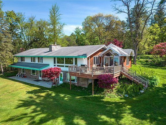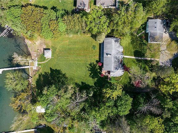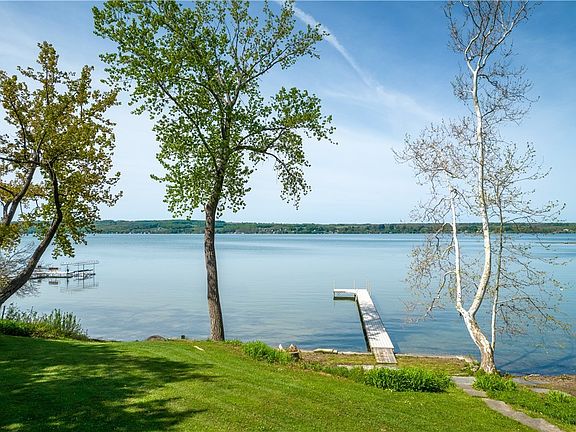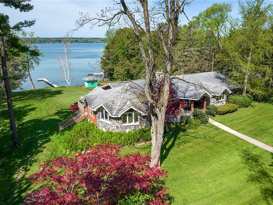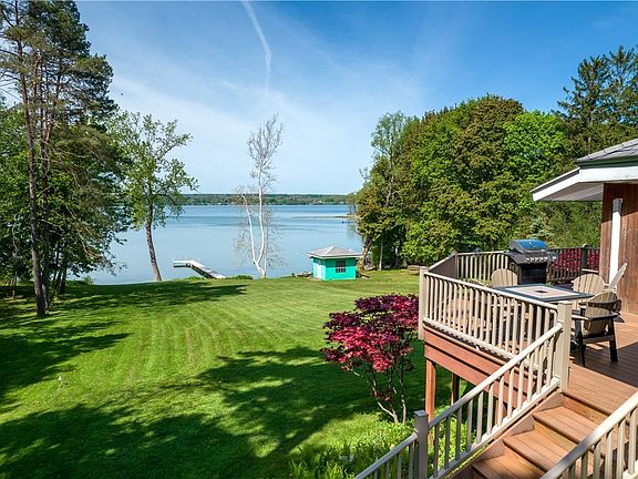 One of a kind lakeside estate with 160 feet of level frontage situated on 1.7 acres on the coveted east side Owasco Lake; located on a private drive surrounded by mature trees this waterfront oasis is the perfect year round retreat! This 4 bedroom 2 full bath ranch features gorgeous lake views from almost every room; hardwood floors run throughout the first floor, the large family room with a gas fireplace and natural stone hearth opens to the kitchen / dining area featuring natural wood beams and sliding glass doors; a large composite deck overlooking the manicured yard and private beach. The lower walkout level features large windows for ample lighting, entertaining area, home gym and 4th bedroom with full bath. Outside a 3 car garage and circular driveway leads to a walk way and welcoming front porch; the back patio stretches the length of the house and cabana by the waterfront. This property features the rare opportunity for evening sunsets and ultimate privacy with public gas, sewer and water just 3.5 miles from Emerson Park and the city of Auburn.