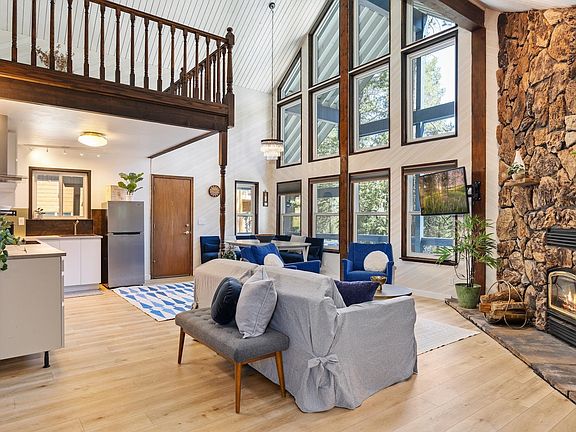 Discover tranquility in this contemporary cabin in the highly desirable Pla-Vada Woodlands neighborhood, which backs to direct trail access. Step inside to a welcoming living area, highlighted by beautiful towering wood ceilings, open beams, and newer luxury vinyl plank flooring. The room centers around a traditional wood-burning stove with stone hearth, adding a touch of rustic warmth during the snowy summit winters. The kitchen features newer stainless steel appliances, updated modern cabinetry and light fixtures. With 3 beds, 1.5 baths, and a spacious loft, this cabin has it all! The front and side covered wraparound deck provide a lovely setting to enjoy the crisp mountain air and allow for easy access to the front door in winter. The recent updates also include all new dual pane windows, interior and exterior paint, new carpet, washer and dryer, Google nest WiFi thermostat for the central heat, and the crawlspace was insulated and encapsulated with an automatic dehumidifier to keep it clean, dry and warm. Utilize plenty of storage in the extra large snowmobile garage. Plavada is well known for its stellar access to trails, rivers, and lakes, and close proximity to world class skiing and snowmobiling. Plavada HOA includes water, sewer, road maintenance and a private beach on the Yuba River.