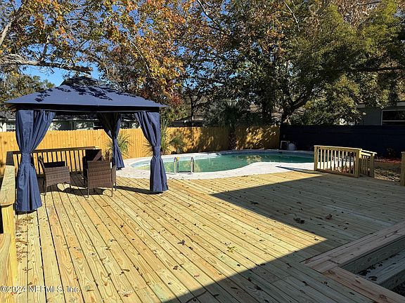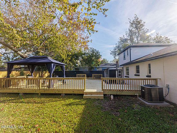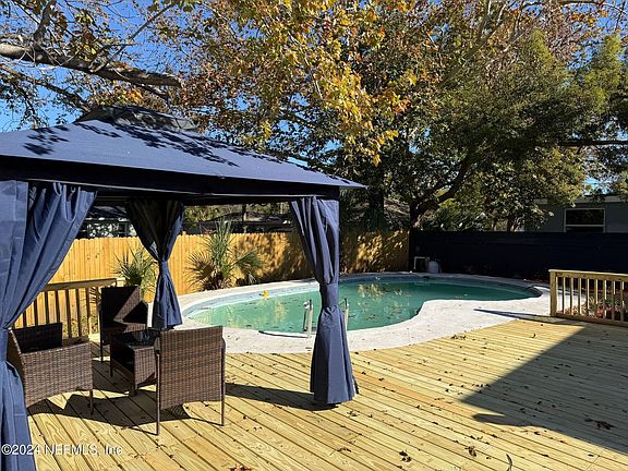 Gorgeous fully renovated home on a beautiful fenced lot with an elegant pool and a huge new deck! This large home boasts 2,100 sq ft, with 4 bedrooms 2 full baths and a half bath. Open and airy layout, perfect for creating lasting memories with loved ones. Gourmet kitchen which showcases white shaker cabinets with granite counters, bar sitting area, designers backsplash and stainless steel appliances. Extra large master bedroom with master bath with large shower with elegant porcelain tiles. Luxury vinyl waterproofed flooring throughout. Oversized laundry room with plenty of storage. NEW PERMITTED Siding, electrical, HVAC. Close to shopping, dining, parks and schools, also an easy drive to Jacksonville International Airport, and to downtown Jacksonville.